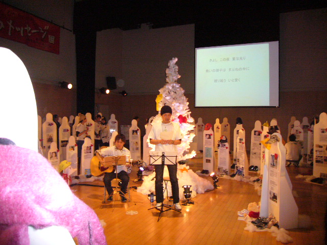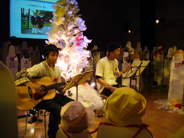 「生命のメッセージ展」は、理不尽にいのちを奪われた人たちの「等身大の人型」「靴」を展示して、いのちの大切さを身近に感じてもらう、アート展です。12月4日~9日まで開催され、最終日のAM11:30~12:00(第一部)、PM4:00~4:30(第二部)に『あなたに出会えたこと。ありがとう』のテーマに沿った曲を生声とギターで演奏しました。