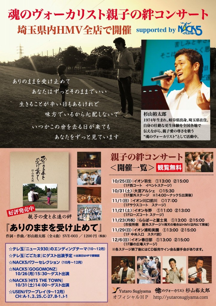 『魂のヴォーカリスト杉山裕太郎☆親子の絆コンサート SUPPORTED by FM NACK5 』を埼玉県内HMV全店7ヶ所で開催!(チラシ・写真・チャリティ情報追加)