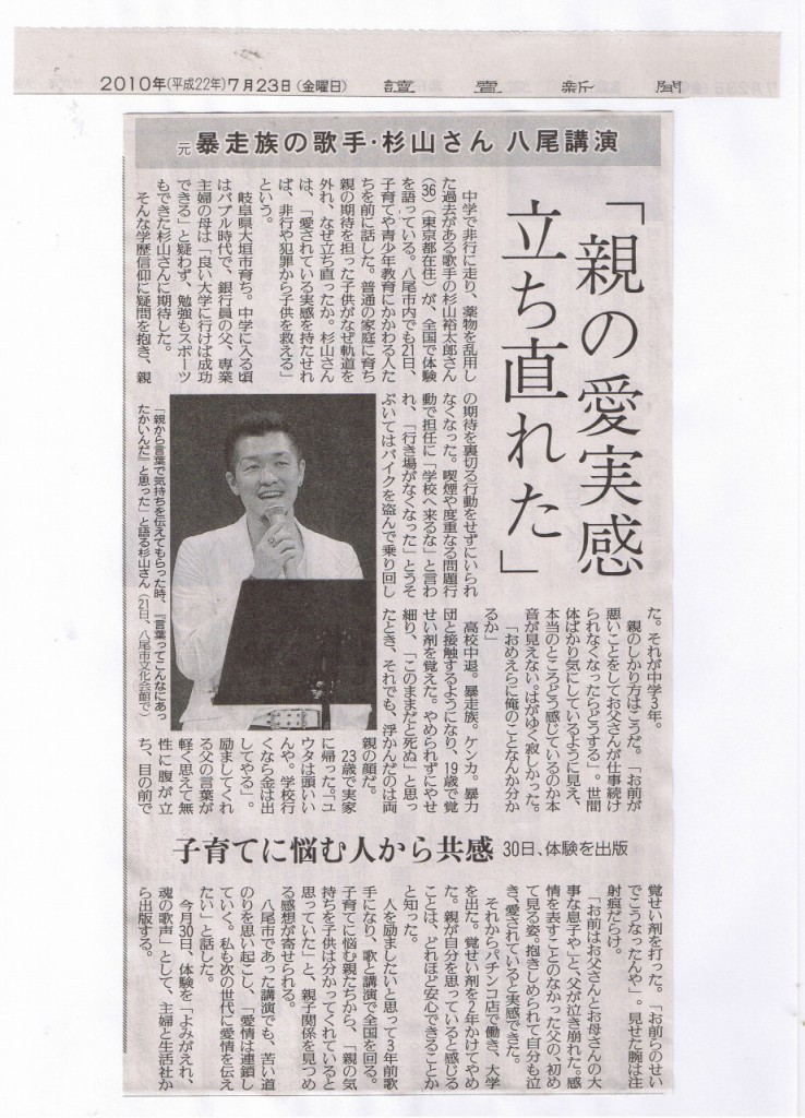 岐阜新聞、中日新聞に、各地での杉山裕太郎講演ライブ記事が掲載。