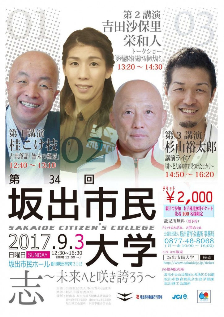 香川県坂出市民大学(第一部:桂こけ枝/第二部:吉田沙保里、栄和人/第三部:杉山裕太郎)にて講演ライブを開催。
